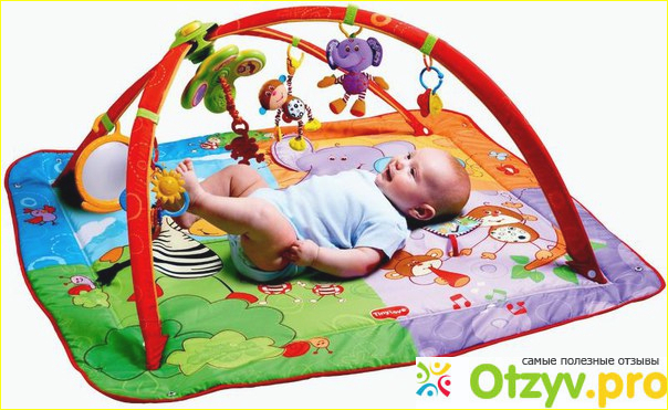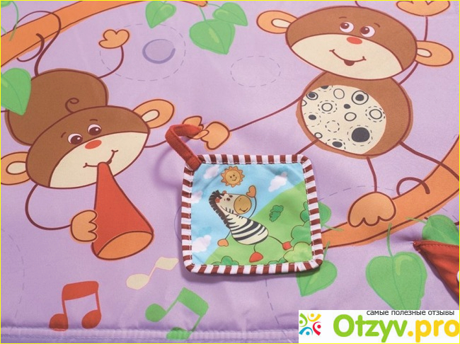 Он сделан без бусинок, нитки нигде не торчат, специально от нуля лет идет. На нем изображены различные животные: пчелка, птичка, слон, обезьянка, зебра, солнышко и так далее. Ободок сверху пластмассовый, очень ребенку нравится его тянуть к себе. Такой развивающий коврик дает отдыхать мамам и заниматься своими хозяйственными делами. Ребенок отвлекается и привыкает играть без присутствия мамы. Развивает мышление и моторику пальчиков. Его берем в поездки и в гости и он чувствует с ним как у себя дома. Его очень удобно стирать в стиральной машинке. Доволен малыш, довольна мама.