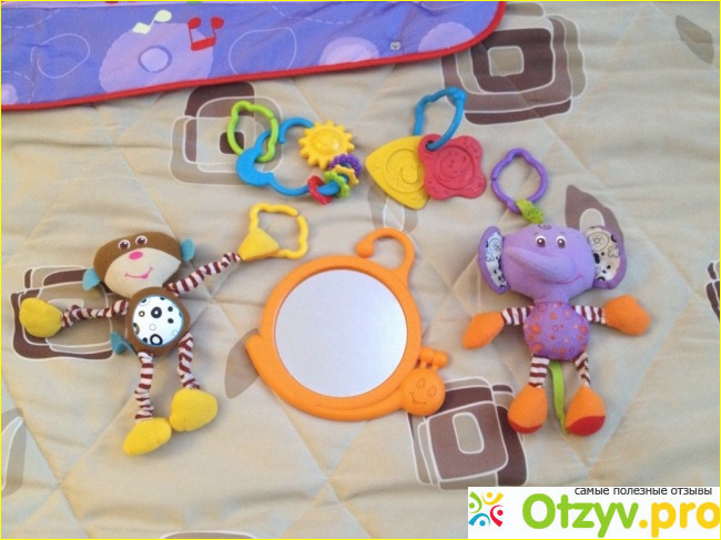 Когда родился ребенок, то наступает момент, когда хочется накупить много игрушек, часто это погремушки. На руках становится носить тяжело и на помощь приходят различные игрушки, но это нужно подолгу сидеть и развлекать малыша и хозяйственные дела маме не поделать. Решили, что погремушек недостаточно, приобрели развивающий коврик "Разноцветное сафари"-это чудо изобретение, положили ребенка, сначала смотрел, так как на тот момент ему было 2 месяца, зато в 2,5 он стал тянуться, рассматривать, играть, смеяться и визжать с ними, ведь на этом коврике они яркие, ткань приятная, мягкая, чистый хлопок.