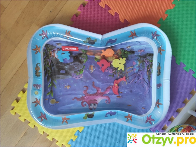 Красочный и удобный размер для малыша. Он наполняется тёплой водой (5 литров), а внутри него есть морские обитатели в виде игрушек. Они начинают плавать. ребёнок увлечённо пытается их поймать. Это занятие отлично развивает моторику руки.