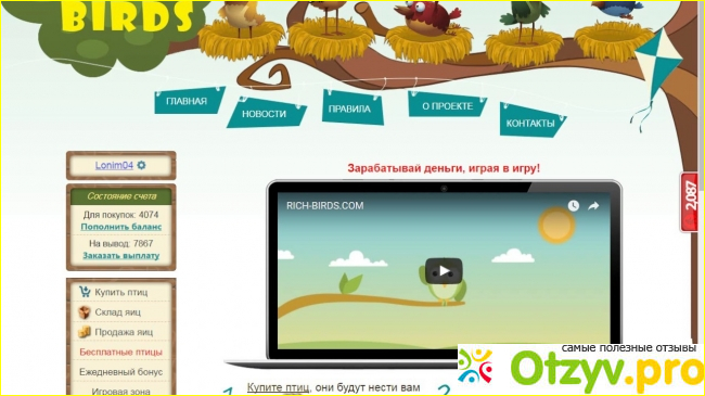 Регистрация не заняла у меня много времени, простая процедура, после чего мне подарили серебряные монеты, на которые вы покупаете самую простую птицу. Такая интересная особенность, существуют в игре разные птицы, чем дороже она, тем эффективнее в плане сношения яиц. Купив за бесплатные монеты самую простую, она будет вам приносить их с горем пополам. Тогда у вас загорится желание приобрести на заработанные монеты более серьезную особу или же внести свои деньги на счет, чего я вам крайне не советую делать. Не могу судить на счет того, платит ли данный проект или нет, у меня по крайней мере до выплаты момент не дошел. Просто надоело постоянно заходить в игру, собирать эти яйца и видеть эти скучные копейки. Не забывайте про минимальную сумму выплаты, до нее вам как до Китая.