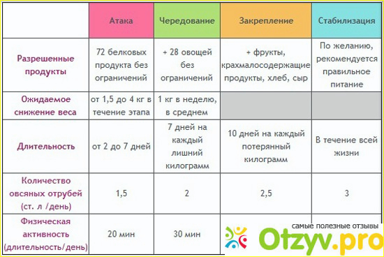 Следующим делом вам надо будет запастись ручкой, блокнотом, календарем и таблицей Дюкана, которую я вам предоставляю в изображении. Вот по этой методике вы собственно и будете заниматься. Сам курс состоит из 4 фаз, которые последовательно вы должны будете пройти.