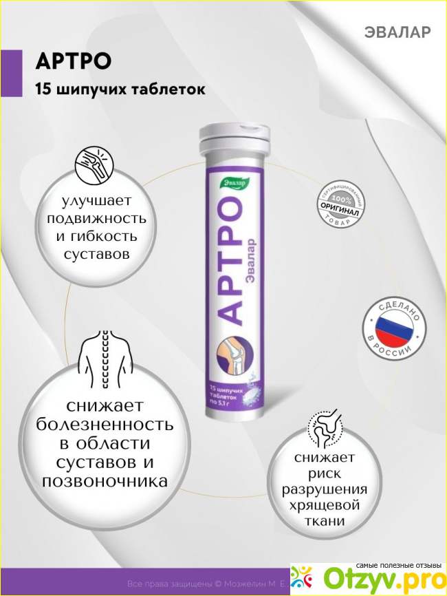 Артро от эвалар помогает снизить риск разрушения хрящевой ткани и стимулирует ее заживление. Продукт также защищает суставы от возрастных изменений и уменьшает боль в суставах и позвоночнике. Это также помогает улучшить подвижность и гибкость суставов, снизить их жесткость и повысить устойчивость к нагрузкам. Преимущества Артро включают состав из 7 ингредиентов для регенерации хрящевой ткани, уменьшения воспаления и боли в суставах и позвоночнике. Форма выпуска в виде шипучих таблеток гарантирует быстрое всасывание компонентов в организме. Более того, продукт обладает освежающим вкусом и приятным апельсиновым ароматом.