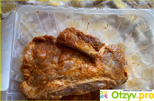 Так как упаковка сверху прозрачная, под вакуумом, можно рассмотреть хорошо ее содержимое. Косточки не очень большие, мяса на них достаточно. Есть, что погрызть. Маринад сам больше напоминает барбекю по вкусу и цвету, но выглядит естественно и пахнет вкусно, когда вскрываешь упаковку.