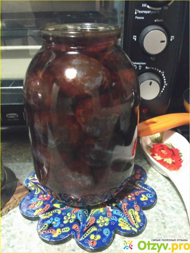 Процедуру "слить сироп - вскипятить - остудить - залить сиропом сливы - поставить под гнет" вы повторяете 8-9 раз. Постепенно ваши сливы отдают сок и сморщиваются, параллельно пропитываясь уксусом.
