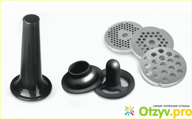 Итак, что же входит в комплект мясорубки? Помимо различного вида решеток, а их аж три, и насадок для колбас и кебе, есть сама мясорубка, естественно, шнек, нож и моторный блок мясорубки, кольцо, которое фиксирует, толкатель и конечно документация, инструкция по применению.