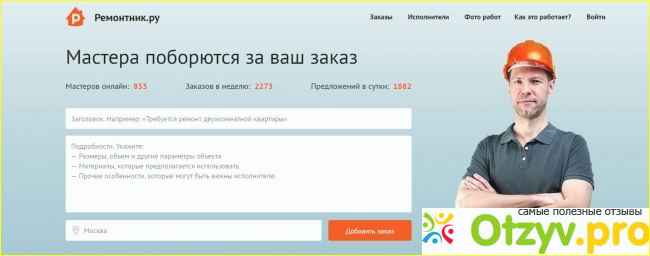 В этом сайте в центр поставлен не подрядчик и его объявления, а заказчик и его заявка на ремонт. Сайт строится вокруг определённых заказов, которые любым пользователем могут добавляться бесплатным образом парой движений мышкой - "построить дом" , "положить плитку" , "заменить кран". Заказчиками описываются свои заказы , а мастера буду соревноваться за него , отправив индивидуальное предложение с ценой и сроком исполнения - именно по этому объекту , а не прайс-листу вообще. Соревнования происходят не только за большие заказы "ремонт квартиры" , но и за любой мелкий "починить розетку". Причём частный мастер будет конкурировать за клиентов наравне с любой строительной компанией. Заказчикам остаётся сравнивать то или иное предложение и изучать самого подрядчика ( по рейтингу, фотографиям выполненных заказов и отзывам). Вы сами выбираете подходящих исполнителей, договариваетесь и работаете с ними напрямик. По такой механике вы очень быстро и без утомительных обзвонов найдёте надежного исполнителя. И сэкономите 20-60 % на стоимости работы.