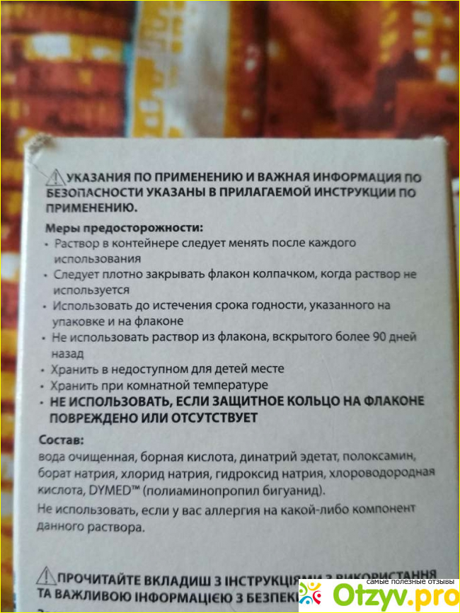 Прозрачная бутылочка, ее удобно держать в руке, тонкий носик – мимо не прольешь. В комплекте есть контейнер для линз двух цветов. Упакован он в картонную коробку с информацией о составе и об особенностях использования. Внутри – инструкция, очень подробная. И описывает порядок очищения и основные правила использования.