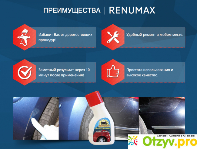 Вот такие преимущества в данного средства “Renumax”. Конечно, есть люди которым хватает средств заехать на сервис и отполировать свой автомобиль. Но порою никому не хочется тратить своё драгоценное время, бензин и средства на поездку, полировку. Ведь намного выгодней и скорее сделать это за 10 минут самому, дома или даже в пути, дороге. Это лично вам совет, решать уже вам. Но все же добавлю что много автосервисов которые хотят побольше спросить с вас денег сами советуют людям не заморачиваться , а просто воспользоваться данной жидкостью.