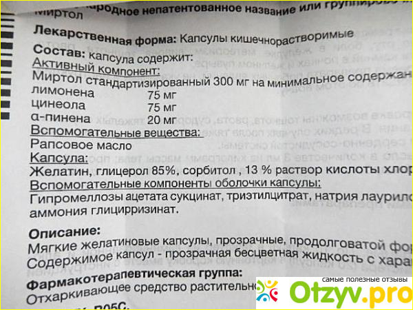 В составе лекарства находится всего один активный компонент. Но именно это вещество оказывает положительные действие на различные воспалительные заболевания дыхательных путей. Называется данный активный компонент миртол. В одной капсуле содержится 120 мг этого вещества. Дозировка достаточно хорошая. за счет этого лекарство оказывает хорошее лечебное действие.