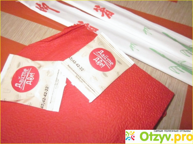 В заказ помимо васаби, имбиря и палочек для суши входят салфетки и жвачки.