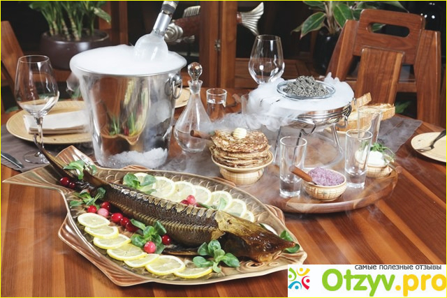 Но также в меню данного ресторана имеются и блюда привычной традиционной русской кухни: борщи, супы, каши, котлеты из щучьего мяса и т. д.