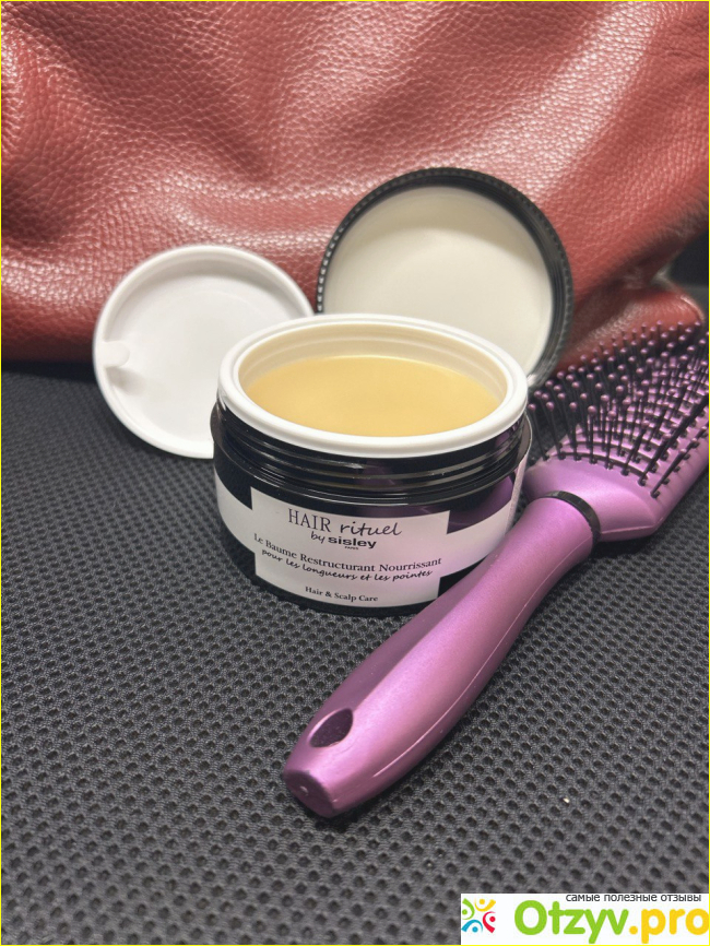 Внутри плотная полупрозрачная масса, ближе к твердому. Подцепить пальцами можно с усилием, в руках уже мягкой становится и чувствуется маслянистая структура. В составе этих самых масел много (ши, макадамия, бабассу и т. д.) + еще витаминный комплекс. Вся эта прелесть должна оказываться только на волосах, не для кожи головы восстанавливающий бальзам.