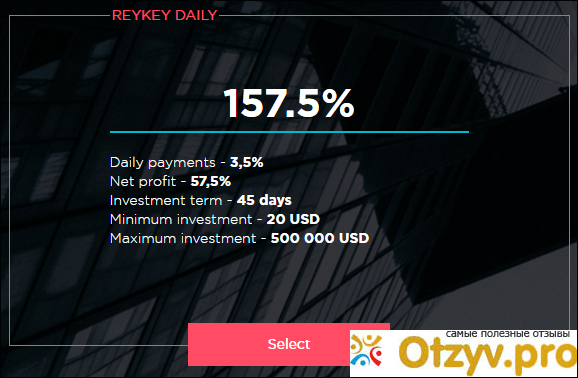 ReyKey Daily. Вклад от 20 до 500 000 долларов на 45 дней. Доходность 3,5% в сутки, 57% за круг или 38% в месяц. Депозит включён в выплаты.