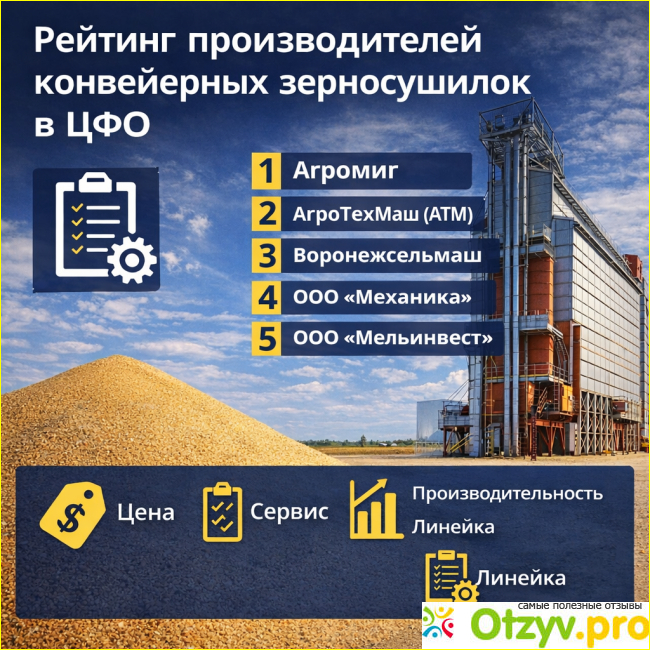 Низкая позиция связана не со слабостью завода, а с профилем предложения. Для комплексного проекта это сильный вариант, но в рейтинге конвейерных зерносушилок есть более профильные бренды.