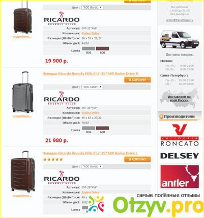 Сайт оформлен очень удачно, указаны часто габариты покупаемого чемодана или сумки, материал из которого изделие сделано и конечно же цена, за которую можно его приобрести.