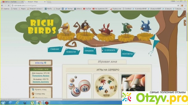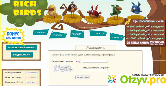 Например, прохождение платных опросов, чтение всякого спама, серфинг рекламных сайтов и т. д. Но однажды, читая платные письма на одном из сео-сайтов, я перешла на страничку, где активно рекламировался сайт rich-birds. Я уже слышала про него до этого. И не только про него. В сети существует не один десяток экономических игр с выводом денег. Но, по сути, эту игру можно назвать инвестиционным проектом. Пока люди вкладывают в него деньги, сайт платит. Как только это прекратится, выплаты тоже закончатся. Но этот сайт все же заинтересовал меня тем, что на нем было зарегистрировано действительно внушительное количество пользователей - более двух миллионов участников! Кроме того, в самом начале предлагались бесплатные птицы. Эти птицы будут нести яйца, которые потом можно обменивать на внутреннюю валюту - серебро, а его уже в свою очередь менять на деньги и выводить на своей кошелек. Возможность использовать вебмани кошелек немного прибавляла доверия к этому сайту. Конечно, рекомендовалось вкладывать свои деньги на покупку новых птиц. Ведь чем дороже птица, тем больше яиц в час она несет, и тем больше будет ваш доход. Но я решила пока зарегистрироваться просто так, ничего сюда не вкладывая, и постепенно понять, лохотрон это или нет. Кроме того, если будет накапливаться достаточно серебра, его тоже можно обменивать на новых птиц.