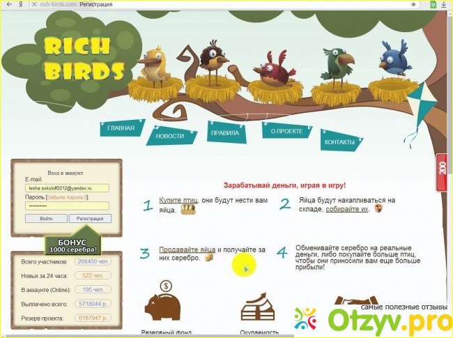 Прежде всего, мне очень понравился дизайн сайта: все просто, лаконично и понятно. Игра кажется очень занимательной. Еще порадовала возможность играть с другими пользователями на золото. Например, в игру "камень ножницы бумага". Я день изо дня заходила на сайт, собирала яйца, обменивала их на золото... Но в конце концов, через месяц сильно разочаровалась: я решила обменять золото на деньги, а в итоге вышла сумма чуть более десяти рублей. Конечно, обидно, но тут и ожидать итого не стоило, так как своих денег я туда еще ни копейки не вложила. У меня появилась мысль, что стоит попробовать немного вложиться, хотя бы рублей на двести. Все-таки сайт вроде бы надежный, там зарегистрированопочти полмиллиона пользователей. Сайт точно платит - я попыталась вывести эти десять рублей, и мне это удалось, деньги пришли в тот же вечер. Я уже почти решилась на вложения, но в конце концов решила поискать побольше отзывов. И... снова разочаровалась. Оказалось, что аналогичных этому сайту есть великое множество сайтов в интернете, они даже по дизайну и интерфейсу один в один. Только люди разочарованно пишут, что платят эти сайты только временно, а затем сливаются. И я уверена, что"Rich birds" ждет то же самое: пока что он платит, но надолго ли? Я бы не стала рисковать и вкладываться сюда. Так что не советую этот сайт никому.