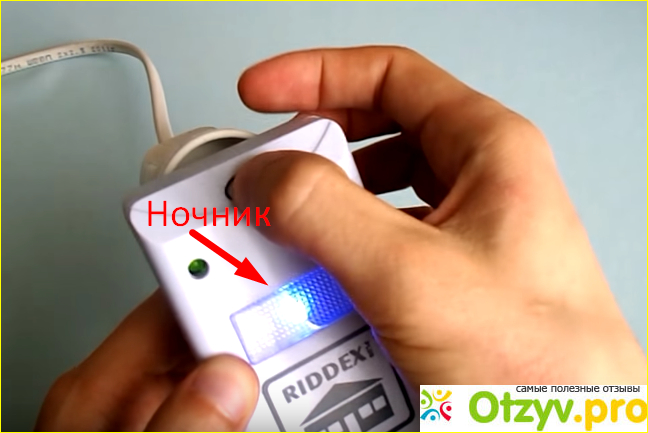 Включить Riddex Plus в сеть, после чего устройство готово к дальнейшему использованию. Загорается зеленый индикатор а красный индикатор мигает. Плюс, данное устройство оснащается ночником, который включается кнопкой. Работает постоянно, то есть, раз включили и забыли.