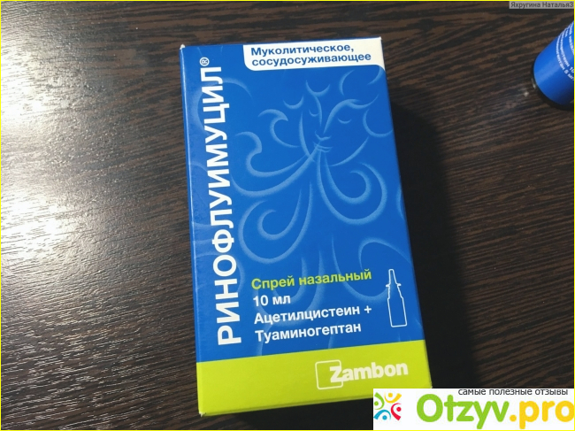 Ринофлуимуцил в своем составе содержит действующие вещества АЦЕТИЛЦИСТЕИН, ТУАМИНОГЕПТАНА СУЛЬФАТ в дозировке по 10+5 мг, выпускается в форме спрея назального почти что прозрачного оттенка, с характерным мятным ароматом.