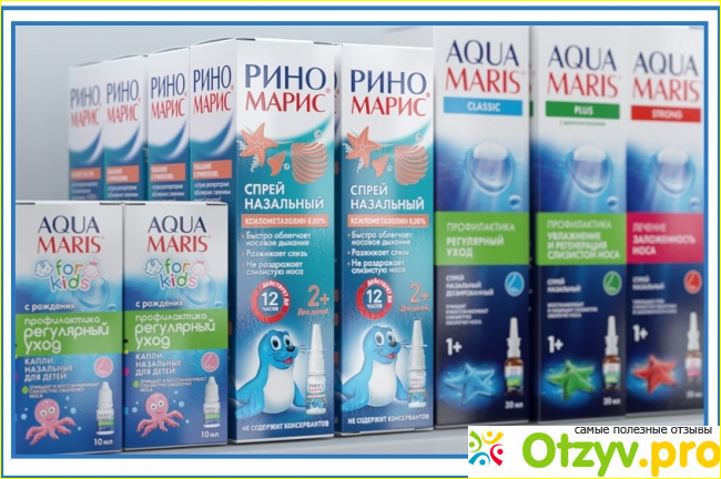 В аптеках представлен широкий ассортимент средств для носа с морской или океанической водой. Если они без добавления лекарственных веществ, то их можно применять всем без исключения, даже новорожденным детям и беременным женщинам. Среди таких препаратов наибольшей популярностью пользуются Аквалор, Отривин Море, Аква Марис, Долфин, Хьюмер, Физиомер, Маример, Мореназал, Но-соль, Квикс. Однако не все из перечисленных препаратов содержат натуральную морскую воду, в составе некоторых гипертонический раствор на основе хлорида натрия, произведенный на фармацевтических предприятиях. Некоторые производители добавляют в состав назальных солевых спреев экстракты целебных трав, витамины. Тем не менее, эти препараты лишь промывают нос, очищая его от слизи. Для нормализации свободного дыхания этого бывает недостаточно.