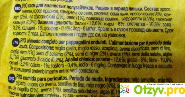 Чуть позже купили корм с разнообразными зернышками - корм RIO для волнистых попугайчиков. Так как летели перышки, выбрала корм rio для волнистых попугаев во время линьки. Первое время, они даже не ели его. Но потом распробовали и отказались от красного проса в чистом виде (чтобы его не закончить, пришлось смешивать с кормом rio). Теперь попугаи только этот корм и едят. Ещё покупаю им палочки RIO для волнистых попугаев и других птиц. Ассортимент достаточно разнообразный.