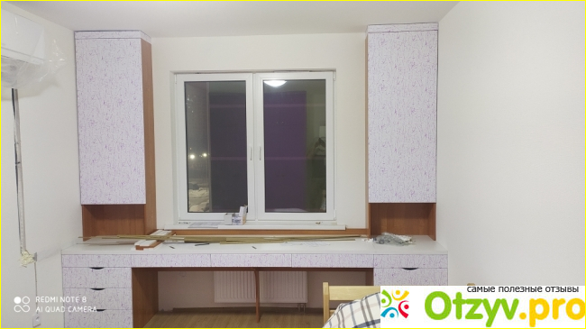 Кстати, замерщик отрисовал будущую мебель в компьютерной программе. Интересно было увидеть предварительный результат. Он и же бумаги оформил. Привезли мебель через 20 дней примерно. Со сборкой пришлось дня три подождать, день переносили, менеджер звонила по согласованию. Собрали в итоге без нареканий, быстро и качественно. Рабочая зона смотрится современно, покрытие необычное, но интересно, дочь в восторге. Сама рабочая поверхность большая, шкафы по бокам смещают все нужно, есть и ящики с обеих сторон для вещей.