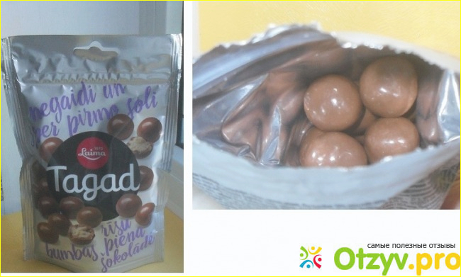 Внутрь молочного шоколада заключена опять же не вафля, что чаще всего встречается, а рисовый шарик. Вес изделия такой же как и у шоколадных плиток Tagad, но упакованы шарики в фольгированный кулечек с зип-замком.