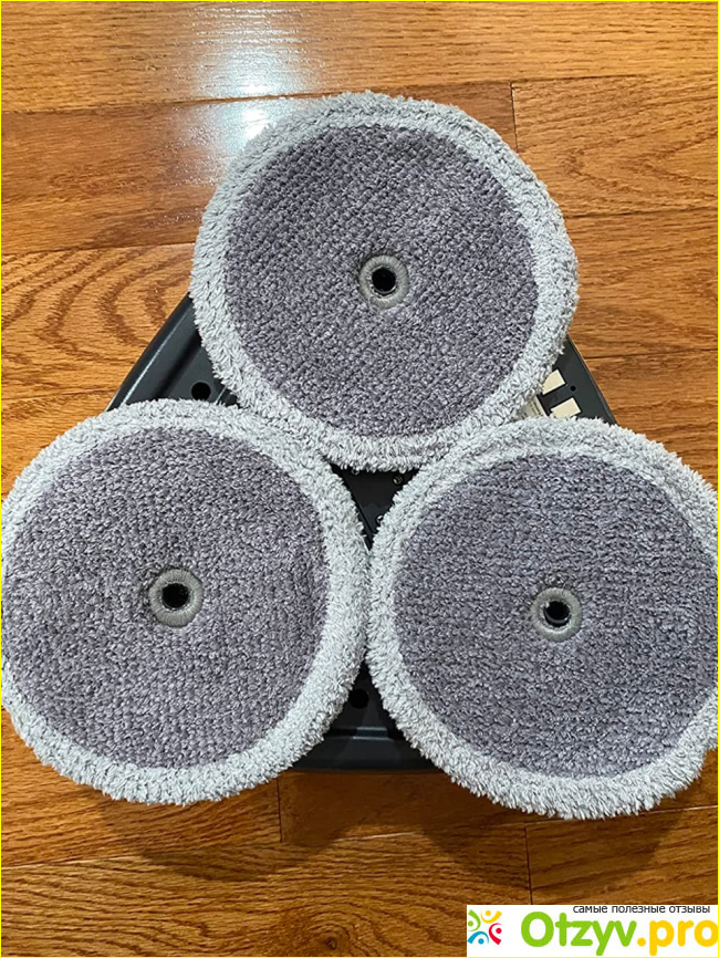 Вместо них у него 3 вращающиеся диска, на которые крепятся салфетки для мытья пола. За счёт этой изюминки мойка пола максимально эффективна, ведь нет следов и разводов. Кстати, два комплекта салфеток для сложных загрязнений и глянцевых поверхностей, идут вместе с полотером. Но я докупала еще дополнительно, так как у нас 3 комнаты и во время уборки, я меняю салфетки, для более чистого мытья пола. Грязные кстати, просто стираю в стиральной машине, сушу и снова можно намывать полы.