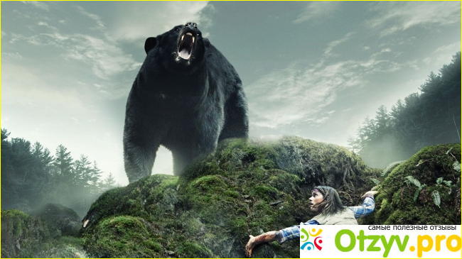 Но увы, проблема фильма в медведе. В целом тоже хорошо. Я не знаю, как делали медведя для экрана, но сделан он реально страшно (хотя не покидают сомнения, действительно ли медведи такие огромные, размером с микроавтобус, в жизни). Медведь появляется в кадре мало, но мы ощущаем, что он где-то близко. Нам то покажут межвежье логово, то труп животного, то он приходит ночью. Создатели молодцы, они сумели нагнать страха, даже не показав медведя, но сделав так, что он чувствуется рядом. Нападения медведя тоже хороши, хотя и показаны редко и фрагментарно. Видимо бюджет был крайне маленький и отсюда такая съёмка, например в сцене с палаткой, когда одну только голову показывают.