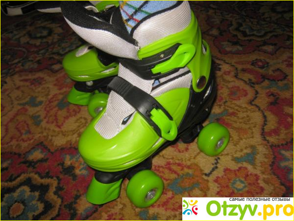 Пяточного тормоза на коньках нет - это один из видов торможения, которые никогда не помешают. К сожалению, его нет но зато есть хороший совет менять местами задние и передние колёса - это продлит срок их службы и предотвратит колеса от износа. Размер можно регулировать и делать это очень просто нужно нажать чёрную кнопочку с надписью Push и одновременно с нажатием двумя руками немного растянуть конёк. На коньках обозначение четырёх размеров буквами - ABCD, то есть в пределах тех размеров, которые указаны на эти коньки, внутри еще существуют четыре раздела.