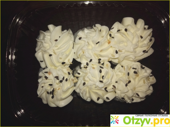 В каждом моем заказе обязательно присутствует ролл сливочный лосось. Ролл относится к категории холодных классических роллов. В состав входит лист нори, рис, лосось и самая большая изюминка это сверху шапочка из сливочного сыра Креметте, который является альтернативой сыру Филадельфия. Шапочки выполнены в форме розочек, а сверху посыпаны темным кунжутом. Ролл очень вкусный и в этой доставке большой. Классический ролл не помещается за один раз в рот. Стоимость ролла 200 рублей. Вес 185 грамм. В суши барах как правило такие роллы в половину меньше.