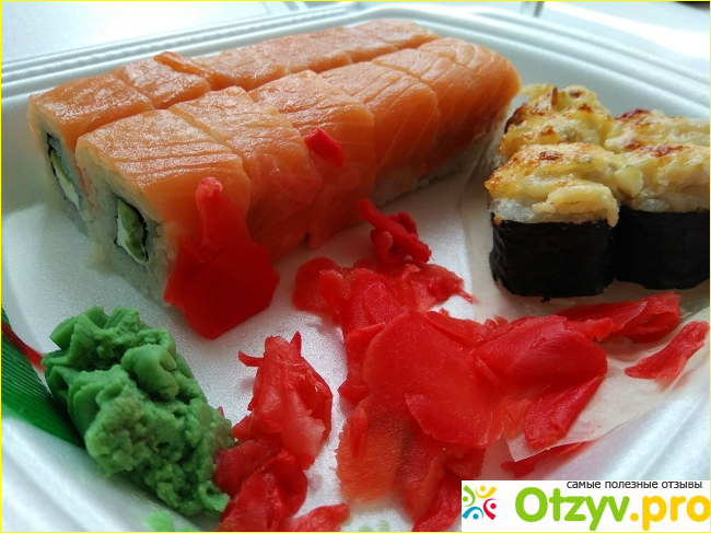 Очень приятно, что торговцы бара не пожалели имбиря. Я сначала подумала, что это за овощ, малиновая стружка, почти как острая морковка по вкусу и консистенции. И только потом до меня дошло, что это имбирь. Нужно бы узнать рецепт этого блюда. По поводу васаби мнение разделилось. Была пара фанатов этого зелёного хрена. Остальные проигнорировали. Ещё мы брали соевый соус и маленькие такие контейнеры под него. Но это отдельно. В целом, посиделка удалась. Пиццы и роллы съели, пообщались, хорошо.