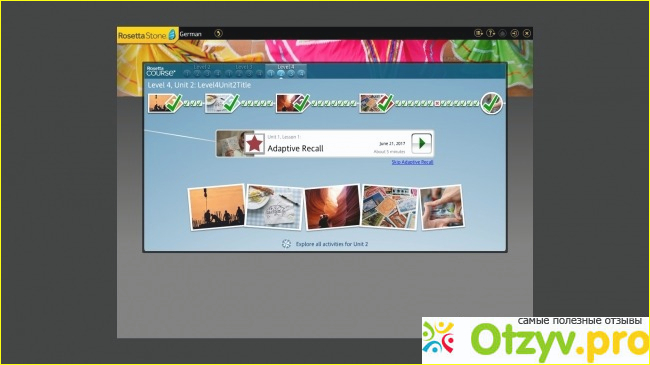 Итак, Rosetta Stone Deutsch состоит из 5 уровней немецкого языка (для остальных языков количество уровней может различаться). Каждый уровень делится на 4 под-уровня, а каждый под-уровень на 4 урока. каждый урок освещает свою тему. Например, на первых уроках это Базы языка, Приветствия и представления, Работа и Школа, а на последних уроки включают в себя уже туристические термины.