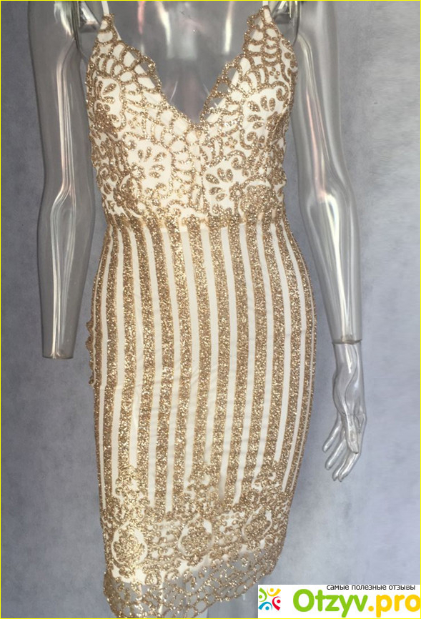 Платье сделано из светлого материала, а сверху сетка с множеством блёсток в золотом цвете.