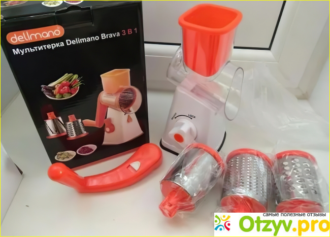 В каком магазине не обращалась везде пожимали плечами и говорили, что давно не видели таких. В конце концов мама приобрела себе кухонный комбайн, где была функция тёрки, крошение для салатов маленькими кубиками и прочие функции. Но этот комбайн очень громоздкий и мама достаёт его только по большим праздникам и торжествам, чтобы готовить на большую компанию. И вот как-то раз, совершенно случайно, по телевизору я вдруг увидела рекламу роторной тёрки Delimano «Брава 3 в 1». Это устройство мне очень сильно напомнило тот наш ещё советский аппаратик, только уже в новом исполнении. Тёрка была с вакуумной присоской и выглядела очень удобно и впечатляюще. В рекламном ролике с ним так лихо обращались и показывали его достоинства, что трудно было удержаться и не приобрести такой простой аппарат. Всё-таки наши магазины умеет расхваливать, так что удержаться невозможно. Уже научились рекламным штучкам, чтобы заманить новых и новых покупателей. Правда цена немного смущала, ведь небольшой набор пластмассовых деталей продавать за цену около 2000 рублей, на мой взгляд слишком. Но так как других альтернатив не было, я решила всё-таки заказать этот прибор, чтобы порадовать маму и бабушку. Сильно уж они расстроились, когда сломалась та старая наша роторная тёрка. В общем заказала и стала ждать, когда она придёт. Пришла довольно быстро уже через 2 недели, вместе с пересылкой она мне обошлась в 2150 рублей. А теперь, что мы имеем по техническим и паспортным характеристикам, указанным в документации.
