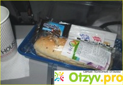 Раз уж речь зашла о сервисе на борту, расскажу немного расскажу о питании. На моем рейсе (продолжительность менее 5 часов) оно соответствовало рациону "Сэндвич", хотя точнее подошло бы название "Легкий перекус". Он включал не самый вкусный в мире сэндвич, бисквитик и напиток. Конечно, наесться этим или даже просто хоть слегка утолить голод, сложновато. А если речь идет о мужчинах или разборчивых в еде детях, то вообще нереально. Поэтому перекус лучше взять с собой, благо правилами авиакомпании это не возбраняется.