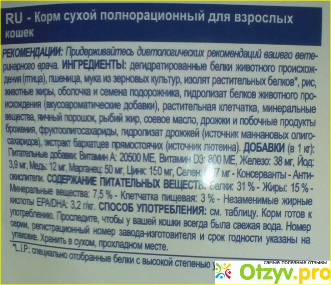 В составе корма довольно много клетчатки, это и помогает бороться с запорами. Только кал у кота начинает сильно пахнуть травой (извиняюсь за подробности). Я пробовала после двух месяцев на этом корме, перевести Кузю на прежний, но запор снова возвращался, поэтому мы стали покупать только его.