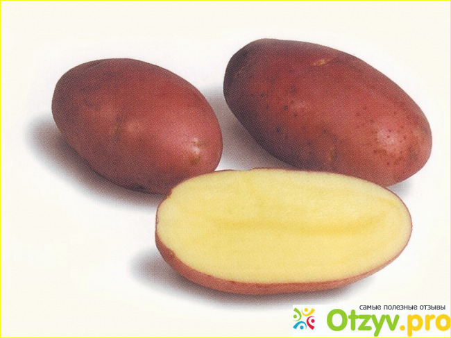 В случае появления красных личинок кусты нужно обработать специальными химическими средствами. Их очень много в магазинах Огородник. Развести средство согласно инструкции и с помощью опрыскивателя нанести на кусты. Если этого не сделать, можно потерять весь урожай. Так, что тут нужно быть предельно внимательными. На внешний вид Розара имеет продолговатую форму, окрас кожуры колеблется от розоватого оттенка до темно-красного с мелкими глазиками и шероховатостями. В разрезе картофель имеет желтоватый цвет. Я думаю, многие знают, что именно у розового картофеля небольшое количество крахмала, в отличии от белого и желтого. Именно по этой причине данный сорт не очень быстро разваривается. Но, тем не менее даже картофель пюре из этого сорта получится вкусным и воздушным.