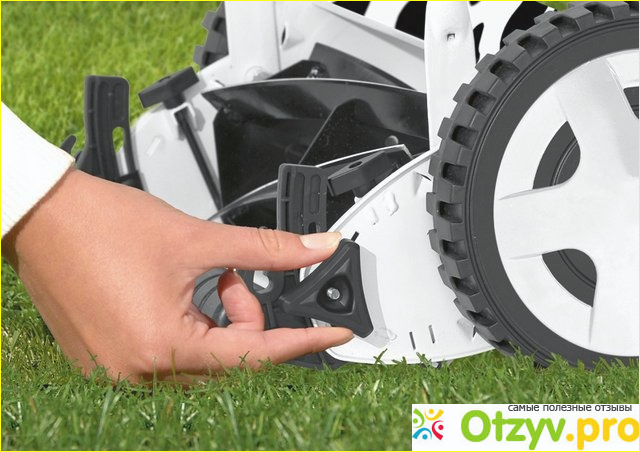 В то же время и слишком низкую траву эта косилка тоже не берет, хотя в технической характеристике указано 1.2-4.4 см. высота среза. Регулировать высоту среза можно с помощью этой ручки.