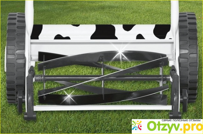 Пока я раздумывала покупать механическую косилку или нет, трава уже несколько переросла. Траву, выше 10 см . эта косилка уже НЕ берет. Она ее просто приминает своим же корпусом. Между колес находится барабан с лезвиями-ножами. Нужно очень быстро толкать косилку чтобы лезвия вращались.