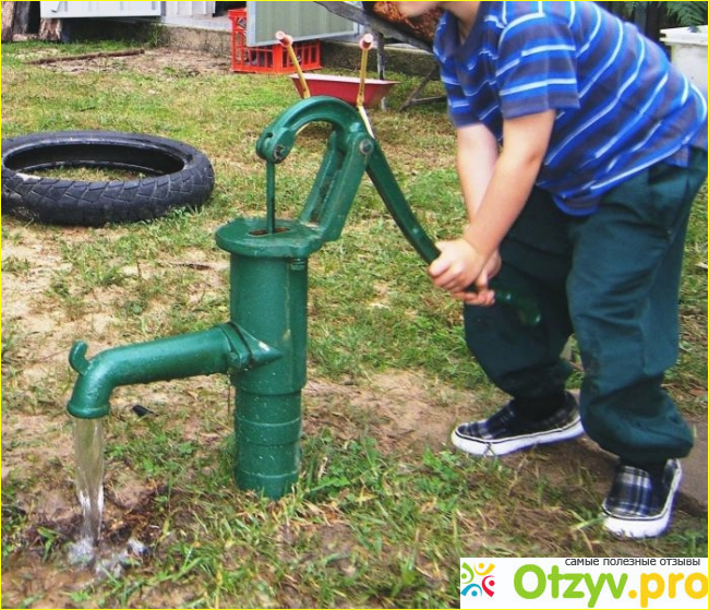 Воду может поднимать на высоту девять метров. В нижней части фланец с четырьмя отверстиями для установки. Качаешь рычаг, и льется вода. Похож на насос для подкачки автомобильных шин. Можно использовать зимой. Все что нужно, дружить с соседями и уметь договариваться.