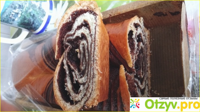 Внутри видно, как он хорошо свернут и насколько широкая прослойка шоколада содержится в данном продукте.