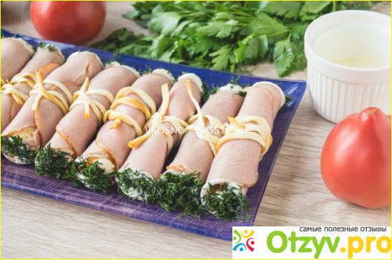 Рулетики из ветчины и сыра часто готовят в качестве закупки для застольев.