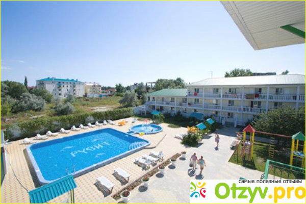 Гостиничный комплекс Русич находится на собственной благоустроенной территории, которая буквально утопает в зелени. Для отдыхающих имеются два бассейна ( взрослый, с гидромассажем, и детский с небольшим фонтаном). Вода в бассейнах всегда чистая, так как каждое утро ее меняют, а бассейны чистят. Вокруг взрослого бассейна стоят шезлонги, а около детского имеется детский городок.