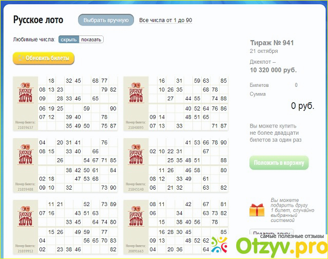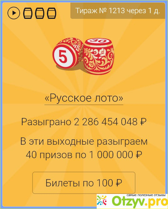 Сейчас в русском лото сулят все те же ценные призы. Джек пот в размере нескольких миллионов, квартиры, загородные дома, путешествия, автомобили. Все очень заманчиво, не правда ли? конечно поэтому и продолжают люди надеяться и покупать на последние деньги билеты популярной лотереи. У меня были хоть и не большие, но выигрыши в русском лото. И я думаю, что все равно буду время от времени весело проводить свое время с этой лотереей.