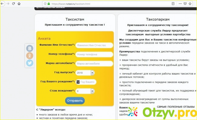 Если вы планируете работать в такси и хотите стать частью команды "Лидер", тогда на сайте "Рутакси" вам необходимо зайди во вкладку "Таксистам и таксопаркам". Для потенциальных работников здесь есть небольшая анкета, которую необходимо заполнить. Она довольно простая и стандартная.