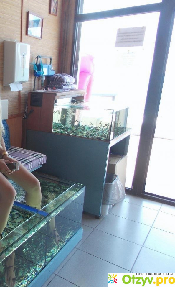Внутри было чисто: коврики, сотрудница в медицинском халате, на полу стояли пять больших аквариумов, ещё два были поставлены выше - это для рук, она были установлены на тумбы. Аквариумы большие, в каждом из которых плавала стайка рыбок, которые называются Гарра Руфа.
