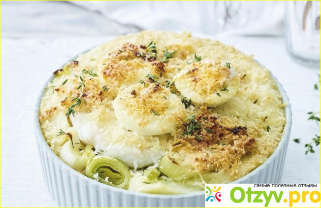 Рыбная запеканка с луком пореем. |