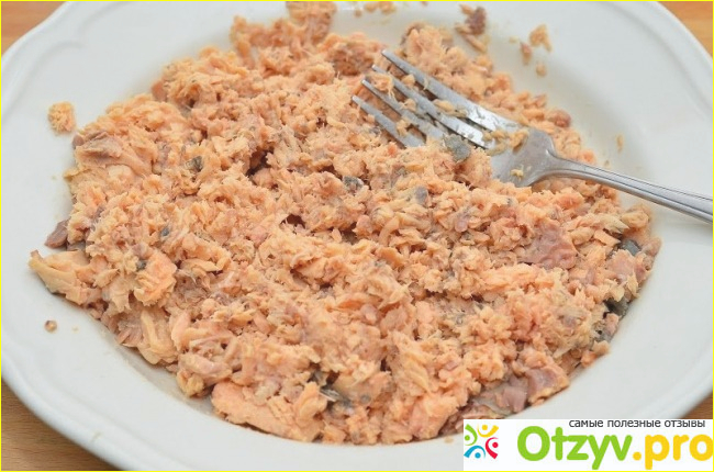 Из консервы сливаем сок и вытаскиваем куски рыбы на тарелку, выбираем крупные кости.