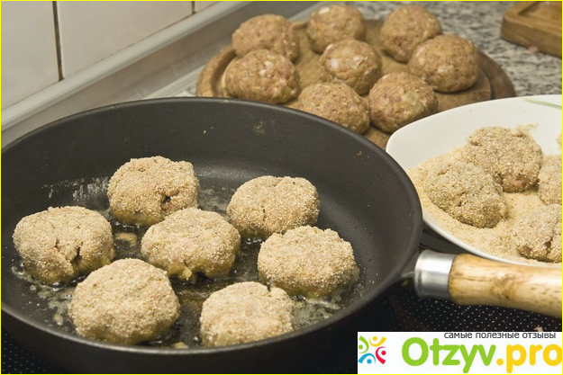 К этому добавляем мелко порезанный лук, два яйца, отварной рис, солим и перчим по вкусу. Все хорошо перемешиваем и формируем котлетки, если фарш слишком жидкий можно добавить в него чуть-чуть муки до нужной консистенции. Каждую котлетку обваливаем в муке или панировочных сухарях. На сковороду наливаем рафинированное растительное масло и хорошо его прокаливаем.